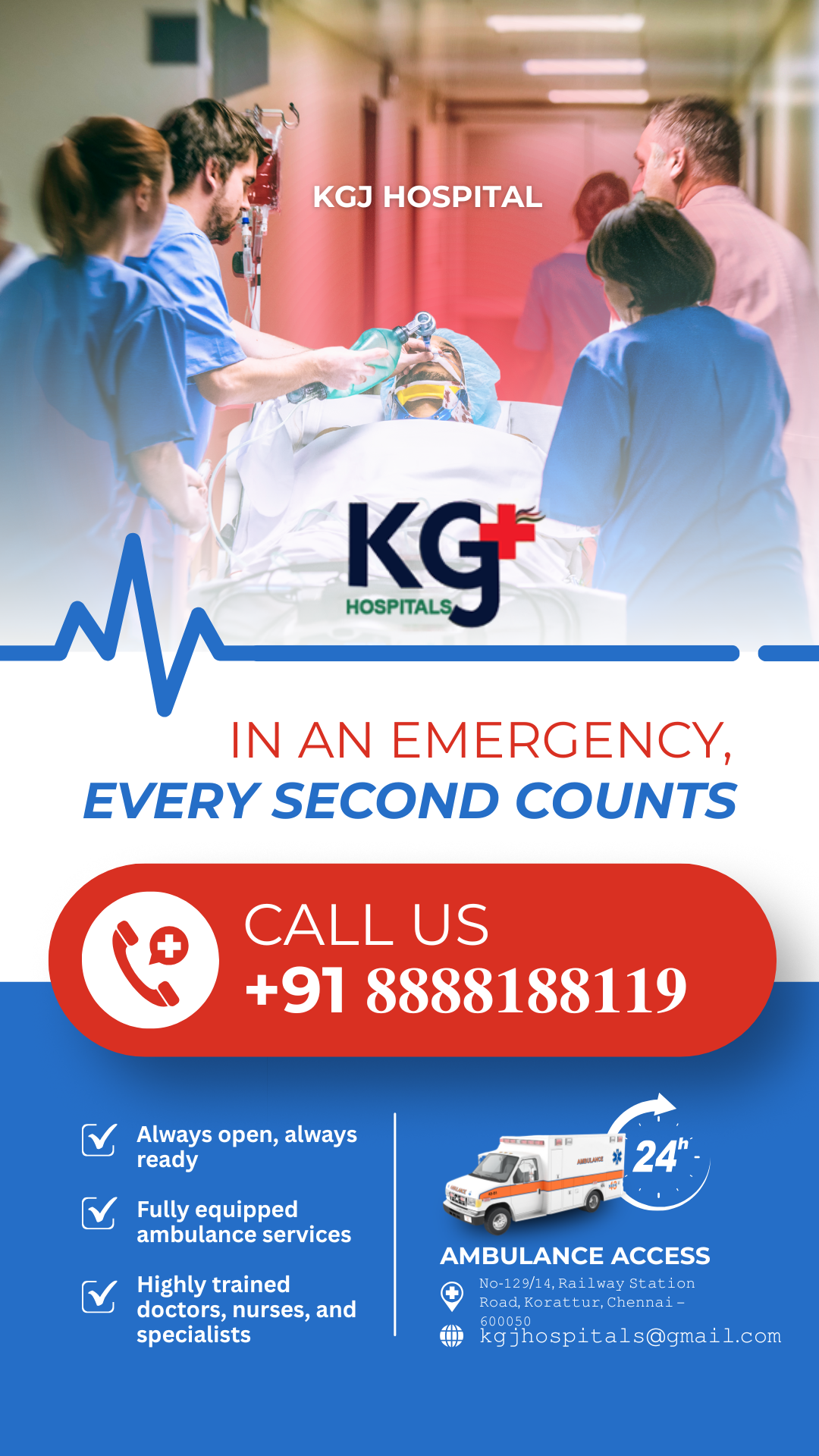 𝐊𝐆𝐉 𝐇𝐨𝐬𝐩𝐢𝐭𝐚𝐥𝐬 is a leading tertiary care Mult speciality hospital strategically located in the heart of Chennai, Tamil Nadu. Privately owned and operated, our mission is to deliver 𝐚𝐟𝐟𝐨𝐫𝐝𝐚𝐛𝐥𝐞, 𝐡𝐢𝐠𝐡-𝐪𝐮𝐚𝐥𝐢𝐭𝐲 𝐡𝐞𝐚𝐥𝐭𝐡𝐜𝐚𝐫𝐞 to all sections of society with compassion and clinical excellence.